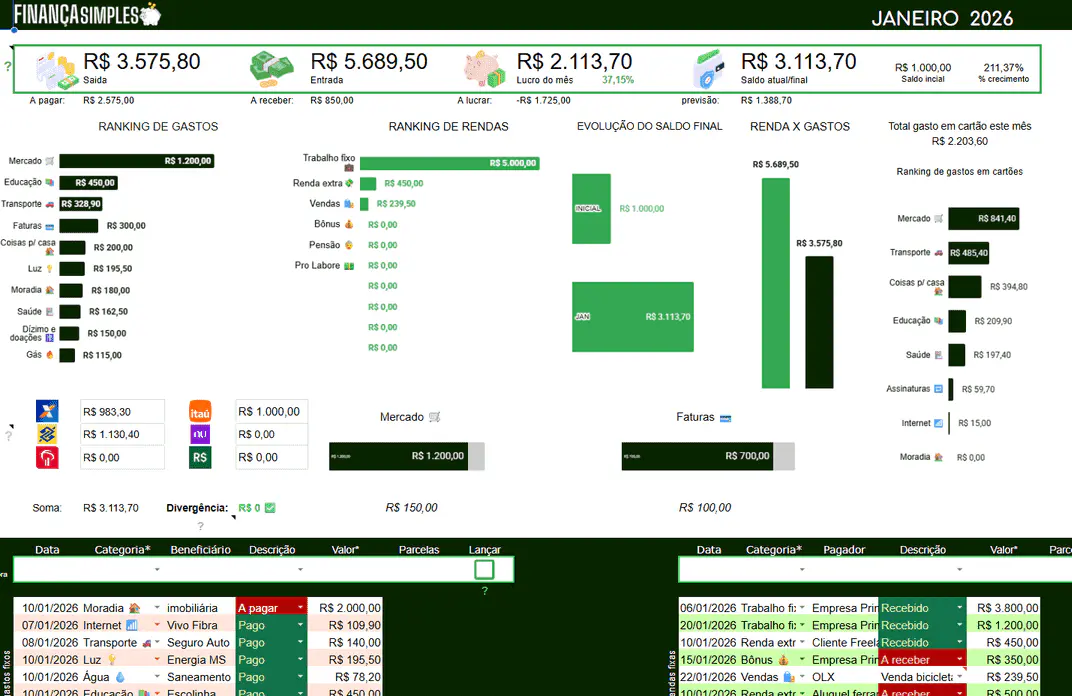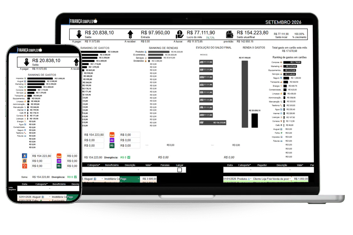 Basta registrar suas transações e o painel contabiliza e atualiza sozinho!