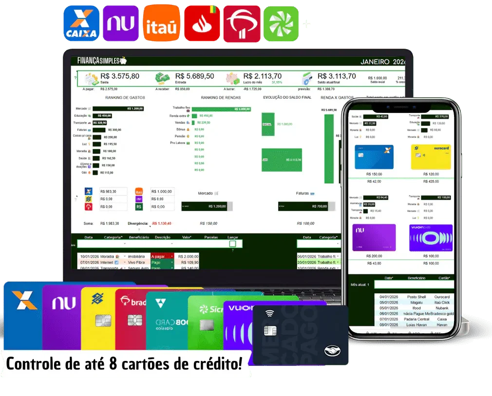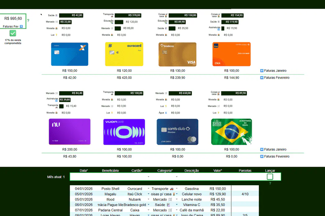 Registre gastos parcelados e a vista de até 8 cartões e o painel contabiliza sozinho, na mesma planilha.